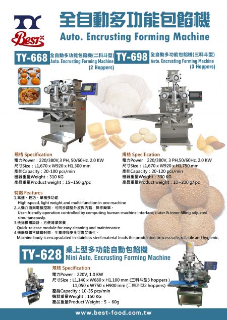 It is suitable for producing all kinds of baking, package and fish paste foods, like pineapple cake, moon cake, handmade biscuits, savory/sweet rice balls, sesame balls, and fish balls. Besides, multiple-filling food products also can be made by TY-698.