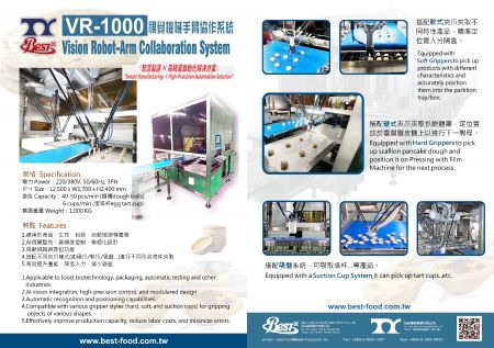 The VR-1000 Robotic Collaborative System is a relatively advanced transformation application in recent industrial automation machinery. It is used in the food production process to transform the original manual or semi-automatic process into less manual or even fully unmanned automatic production, which greatly improves production efficiency and solves the current labor shortage problem in the food baking industry.