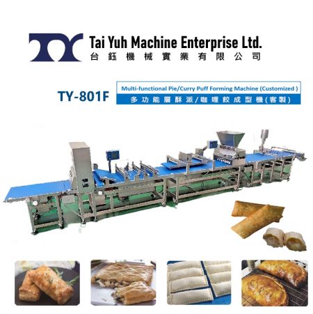 Within our Filling & Forming production line, TY-801F is specifically made for producing bigger half-round (semi-circular) shape of food product like Calzone, Puff Pie, garlic chive calzone, pocket pizza. To place well-mixed dough on the conveyor; passing through sheeting , rolling, filling, folding ,forming & shaping; final product are perfectly completed.