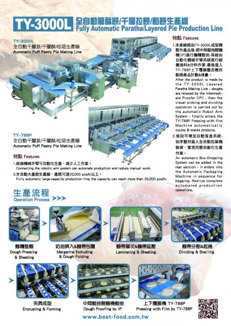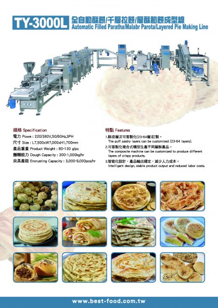 TY-3000L पराठा बनाने वाली मशीन स्वचालित रूप से परत पराठा बना सकती है। उपग्रह रोलर, मक्खन एक्सट्रूडर और 1 सेट फोल्डिंग डिवाइस के साथ।