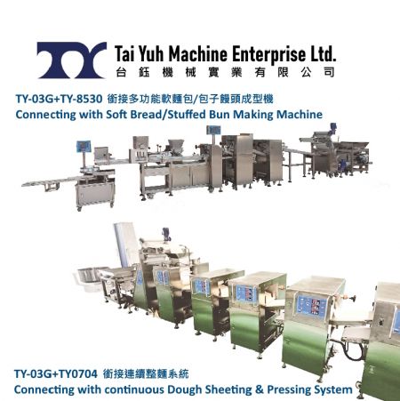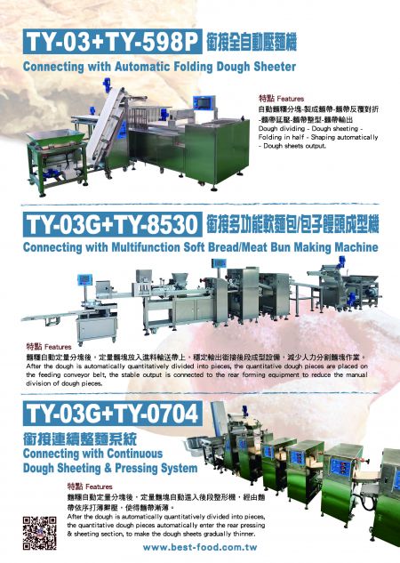 - 適用於大量麵團分割,為大型麵食產品生產線前期製程。如蔥抓餅、墨西哥餅、印度抓餅、麵包、餐包、漢堡、包子饅頭、粉圓、湯圓機等生產線。