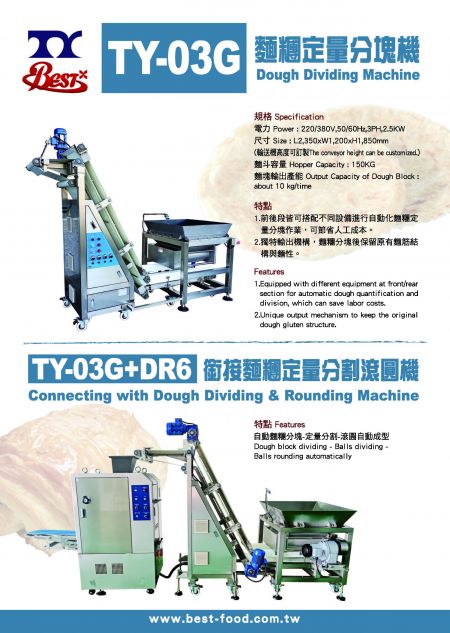-可處理含水量48~58%麵團,自動定量分塊一般麵團、粉圓麵團、湯圓麵團、抓餅麵糰等各式不同類型麵團。