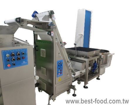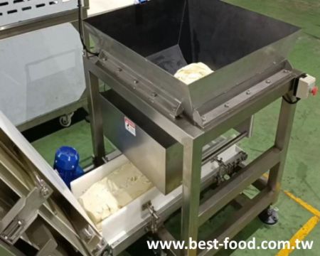 -分塊機之後的端爬坡輸送帶高度可客製化,以銜接各式不同生產設備,如:抓餅、麵包、餐包、漢堡、包子饅頭、粉圓、湯圓機等各式不同食品生產線。
