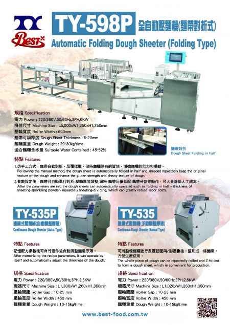 將攪拌好的麵糰放入TY-535連續壓麵機,設定壓麵次數6~8次,麵帶厚度由手動逐步由厚至薄調整,延壓好的麵帶厚度約15~25mm。延壓完成之麵帶可接續TY-810S或TY-812S包子饅頭成形機,全自動生產饅頭、包子、掛包...等產品。