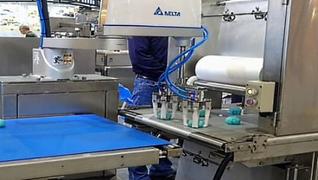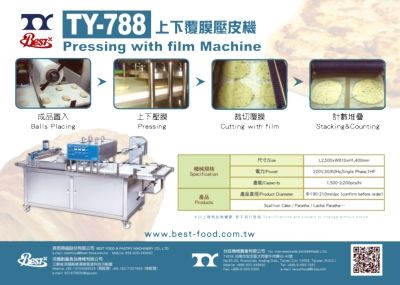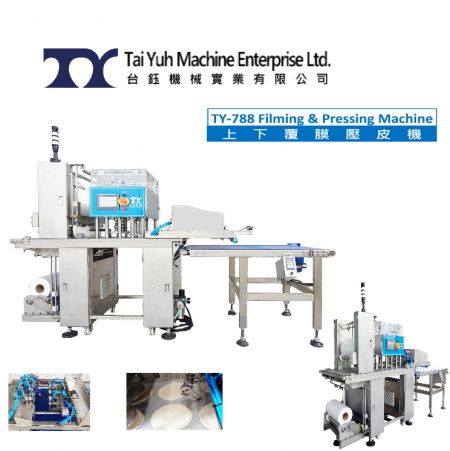 傳統手工壓皮,需人工放下膜紙、麵團、上膜紙、壓皮,手續繁複、相當耗時。TY-788自動壓皮機解決以上問題,整台機器操作、收成品只需3~4人, 每小時最多可壓2,500片,視麵皮伸縮性。可客製化處理特定食品產品如排骨、漢堡肉排…等,隨著技術日益進步及客製需求的增加,目前亦持續研發更多樣整合方案,將覆膜機效能提高至最大化。