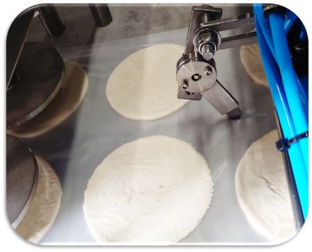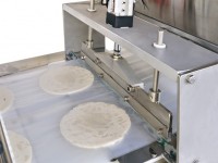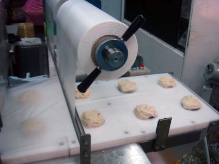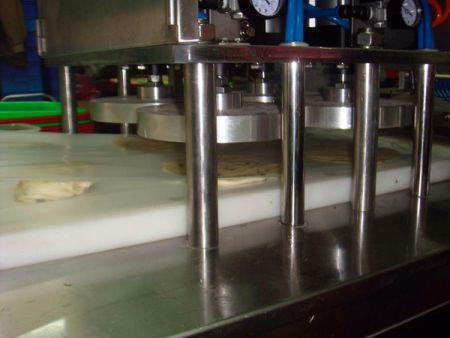 壓皮機上下各架有一PE膜紙捲,使用前將膜紙拉好固定,麵糰放在定點,膜紙輸送往前,麵團送到壓盤下,壓盤下壓時同時上下覆膜。視麵團特性調整壓盤下壓距離及壓皮時間。